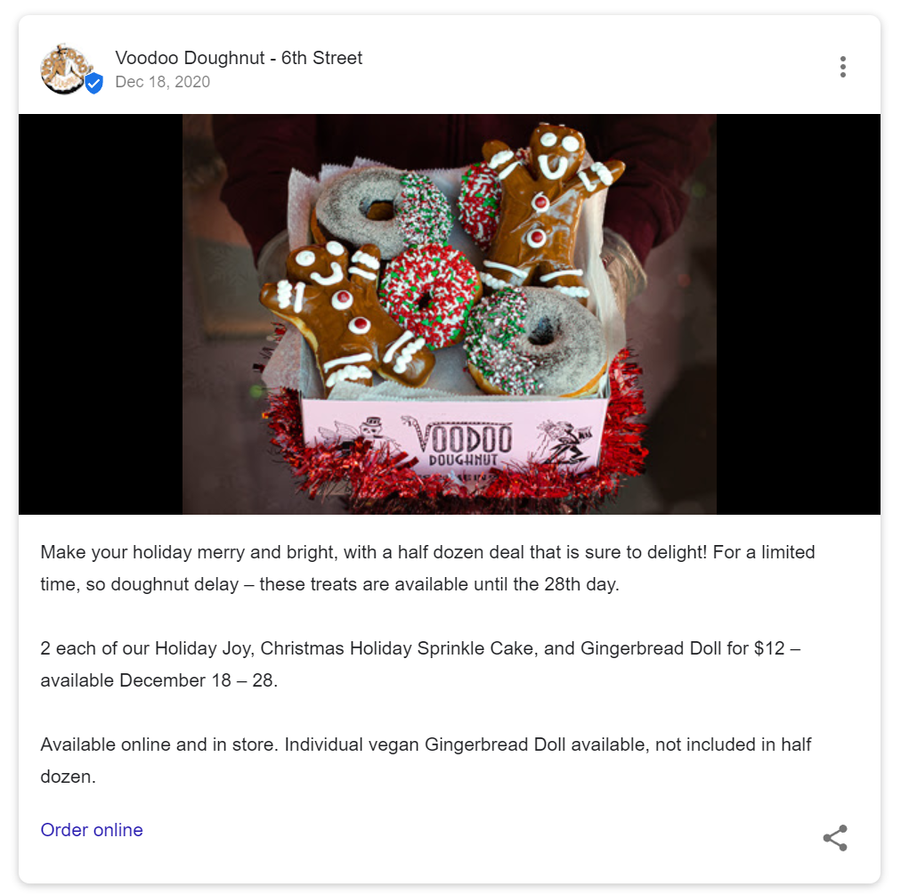 Share your early holiday sales events or offers with searchers with a Google My Business Event or Offer Post.