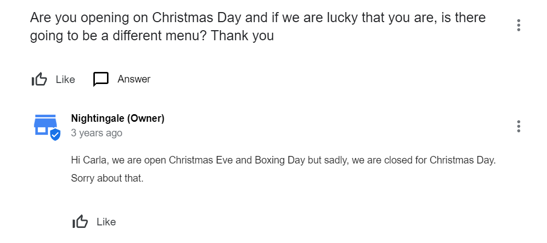 Pro tip: Did you know that 3 question upvotes will bump that question (but only one) to your business profile on Search? Get your holiday promotions, hours, or policies in front of clients by “swapping” your most upvoted question to a holiday-focused question.