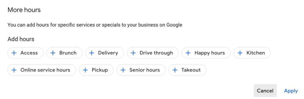 In the Info section, also add any special hours (Special hours) or service-specific hours (More hours).