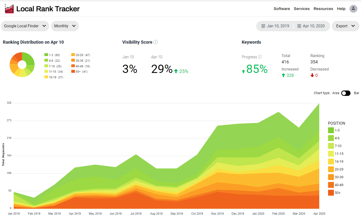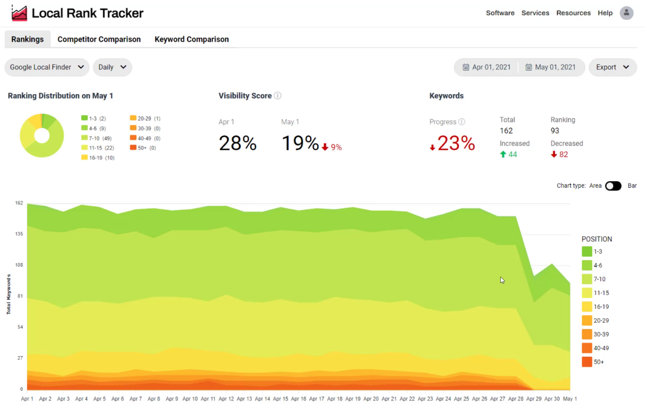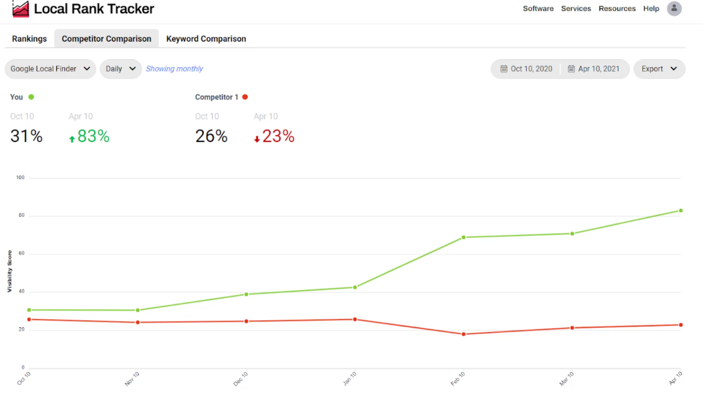 Another question is, how does your business compare with your competitors? Rank tracking software really helps you see how you’re performing versus your competitors. You can see charts like this where from January to April, this business rankings went up and their competitor’s rankings went down.