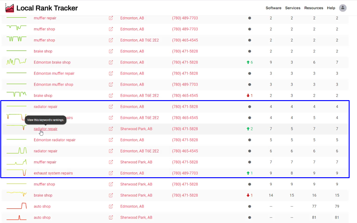 We can see terms like ‘radiator repair’, ‘exhaust system repair’, those are optimization opportunities if these are terms that are important. We want to improve rankings for them. So when you see this, you can say great, these are terms that we want to optimize for and improve optimization on our website, and hopefully push them into the local pack. Then with the rank tracking software, you can measure that impact over time after you make the changes.