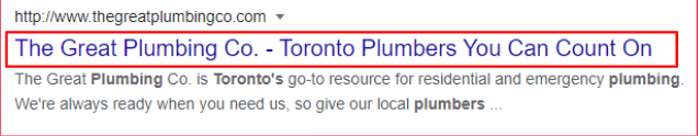 Look at this one. I’ve highlighted this whole thing in red because I think it’s a really great example: The Great Plumbing Co. – Toronto Plumbers You Can Count On, when you see this in the search results against all of the other ones which are just a dump of the keywords, that speaks to me, I’m going to click on that one. I want a plumber I can count on. And they’re great. One of these great plumbers. So there we go.