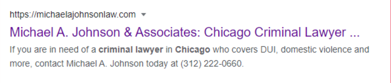 #1. Google will rewrite title tags in the search results if you do this thing, where you just want to tack the brand name to the end of your title tag, Google loves to move it to the front of the title tag, which is really annoying, because I may have had some primary key phrases that I was trying to target. But Google cut them off. For example, in this case, this business’s title tag is “Chicago Criminal Lawyer | DUI | Domestic Violence”, and then they put the brand name. But what Google did is they push the brand name to the front of the title tag. And so all those other important key phrases don’t get visible on the search results. So that’s, that’s one reason why you don’t want to do it.