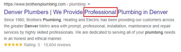 But also, it’s kind of unnecessary. One of the things that they tested was they removed the category “Whiteboard Friday”, from all of their Whiteboard Friday videos. Amazingly, they actually saw a 20% uplift in traffic from doing that. They took that “Whiteboard Friday” out, that’s unnecessary, you don’t need to repeat that on every one of them. By doing that they saw an uplift. Those are significant results. They also tried removing the brand. That actually didn’t work out so well. Because what I said earlier, Moz is a very recognizable brand. You’re going to get more click through because people are like, “Oh, yes, Moz, I recognize that.” Having a recognizable brand, it makes sense. But without the recognizable brand, you can actually see a positive uplift by getting less words in your title tag. So, instead of putting the brand in the title tag, I actually think it makes more sense to put the brand into the description. This way, it will still show up in the search results. You’ll have more space and it doesn’t negatively impact your rankings. Look at this: Jim’s plumbing is already on the job.