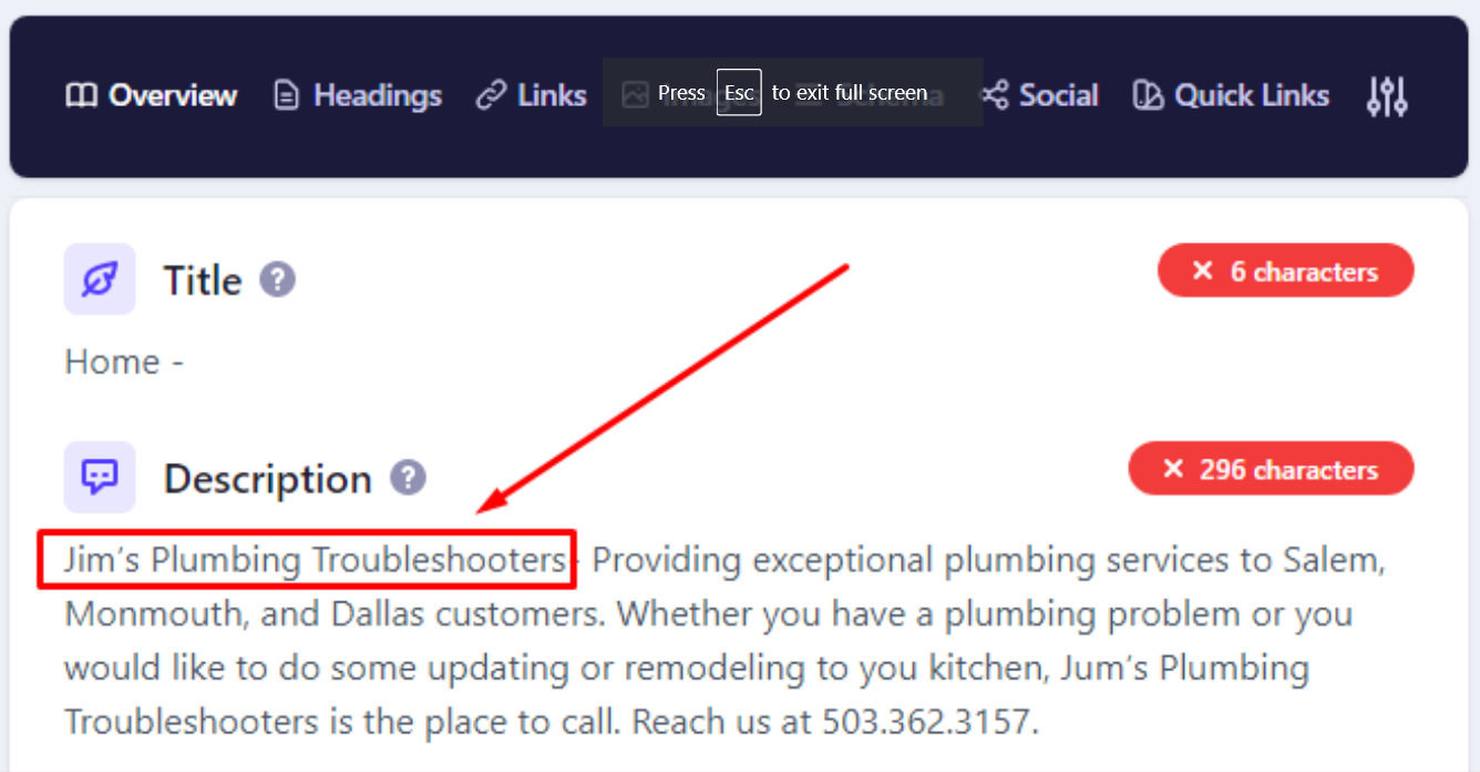 Okay, with this in mind, how can I make Jim’s title tag even better? We had all the keywords in it. Now let’s make it catchy. I’ve updated his title tag, to Jim’s Plumbing in Salem, OR – Plumbers You Can Trust and Count On.