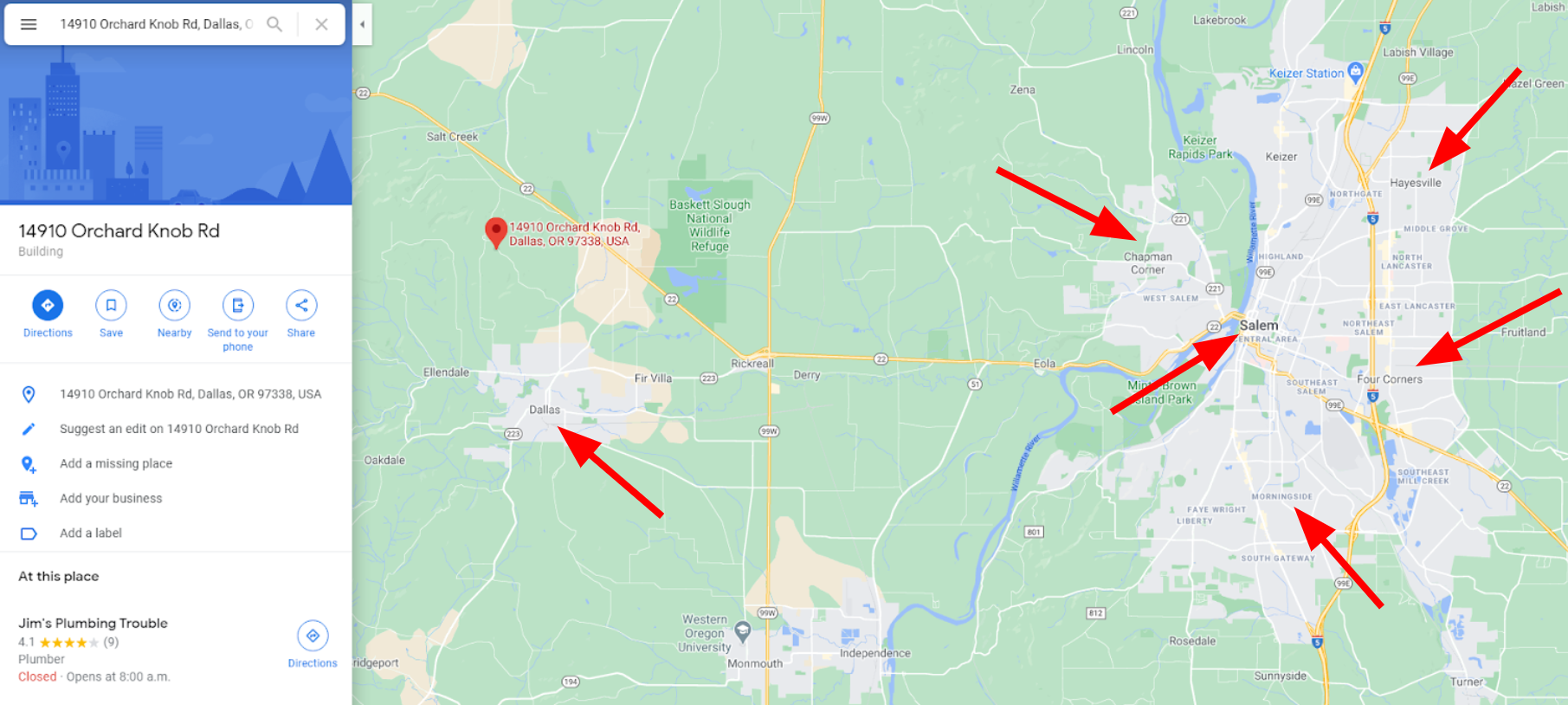 In this case, they’re actually located in Dallas, Oregon, but the primary city that they care about is Salem, Oregon. So definitely Salem is going to be one that we want to target. Then a lot of these other ones, the bigger that they appear, and Google Maps sort of picks them out. A lot of times if you are the business owner, you know what the surrounding areas are that you want to target. But if you’re the SEO consultant, just trying to figure out you can kind of zoom in and figure it out this way.