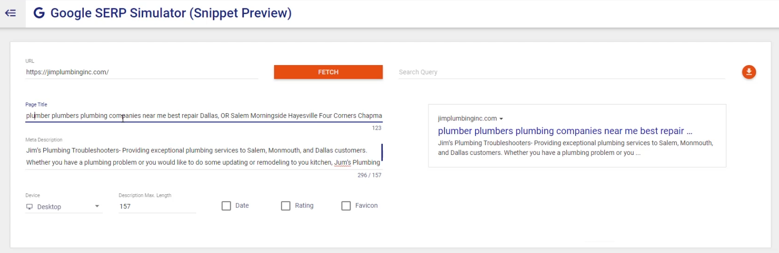Now that we know that space isn’t a concern, let’s take a first crack at writing a title tag with our terms. I’m using this great little tool from Merkle (TechnicalSEO.com) they have a Google SERP Simulator, which allows me to write my title tag in a snippet preview mode so I can see how the title tag is coming together. I put in the URL I fetch is going to give me my existing title tag and pull my description. Now I’m just going to paste in all those dang words.