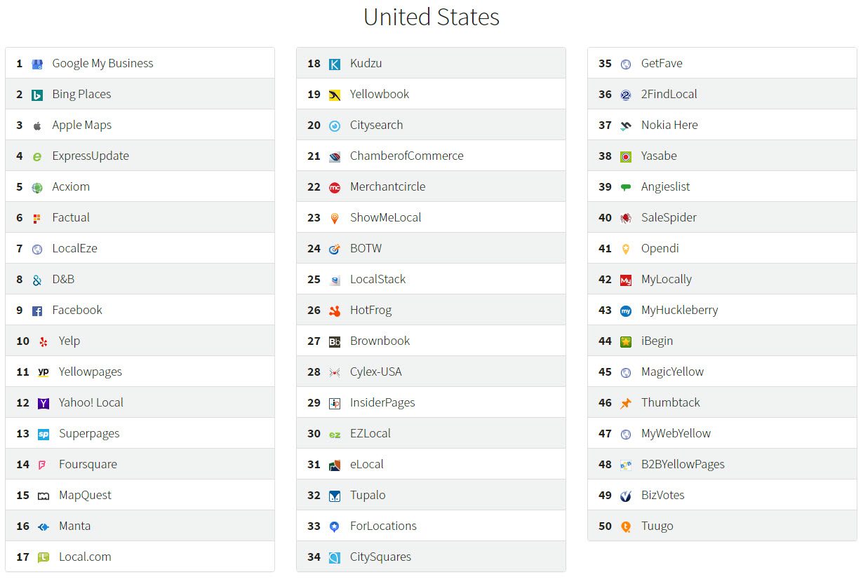 These carefully curated lists include the most important and most valuable general sites in the country. They are âgeneralâ in the sense that they list businesses from almost any industry and any city. You will want to make sure you have one (and only one), complete and accurate listing on each of these sites. They are ordered by priority, so start at #1 and work your way through the list.