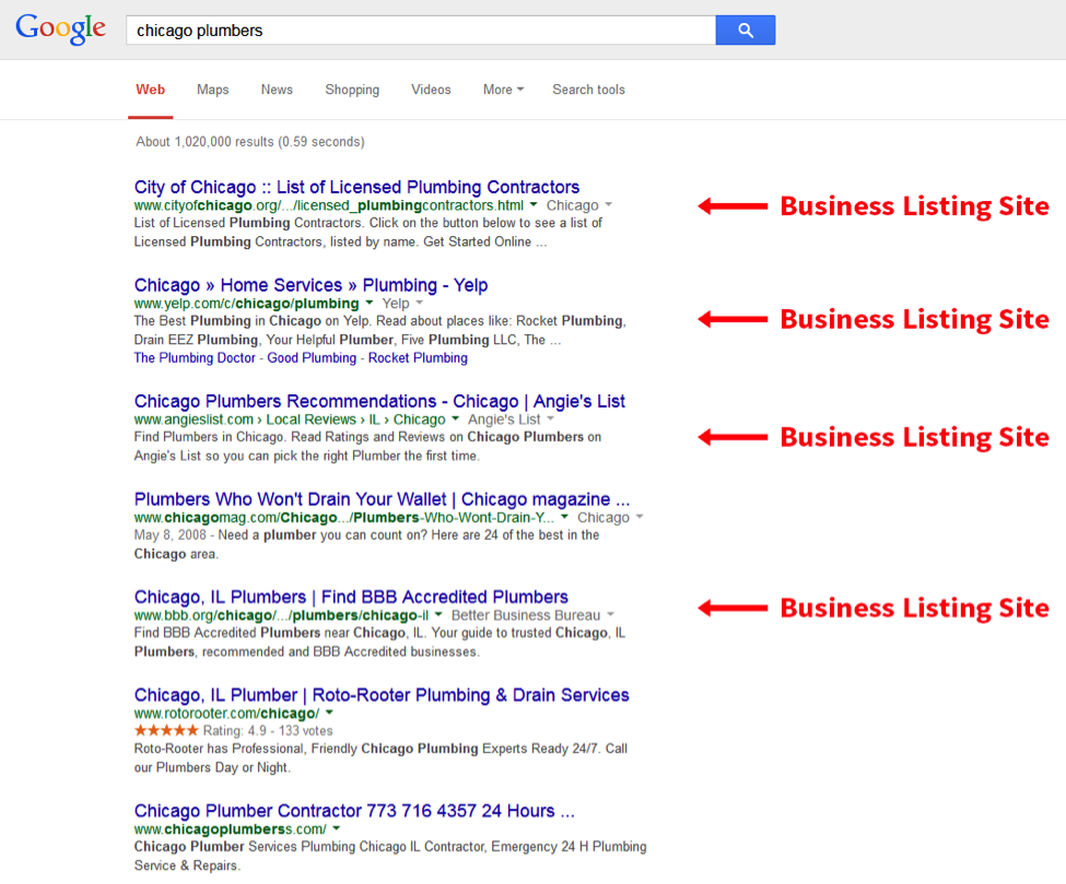 You may be thinking that this is no different than directory link building, but there is a difference. Business listing sites are heavily crawled, indexed, and used by Google to build their local database. We see these sites appearing prominently for most local searches: