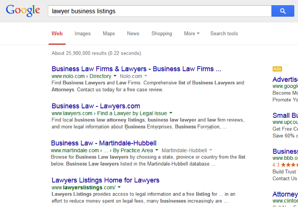 1) Start by searching for your primary keyword in the city of the business (for this example it is Lawyers):