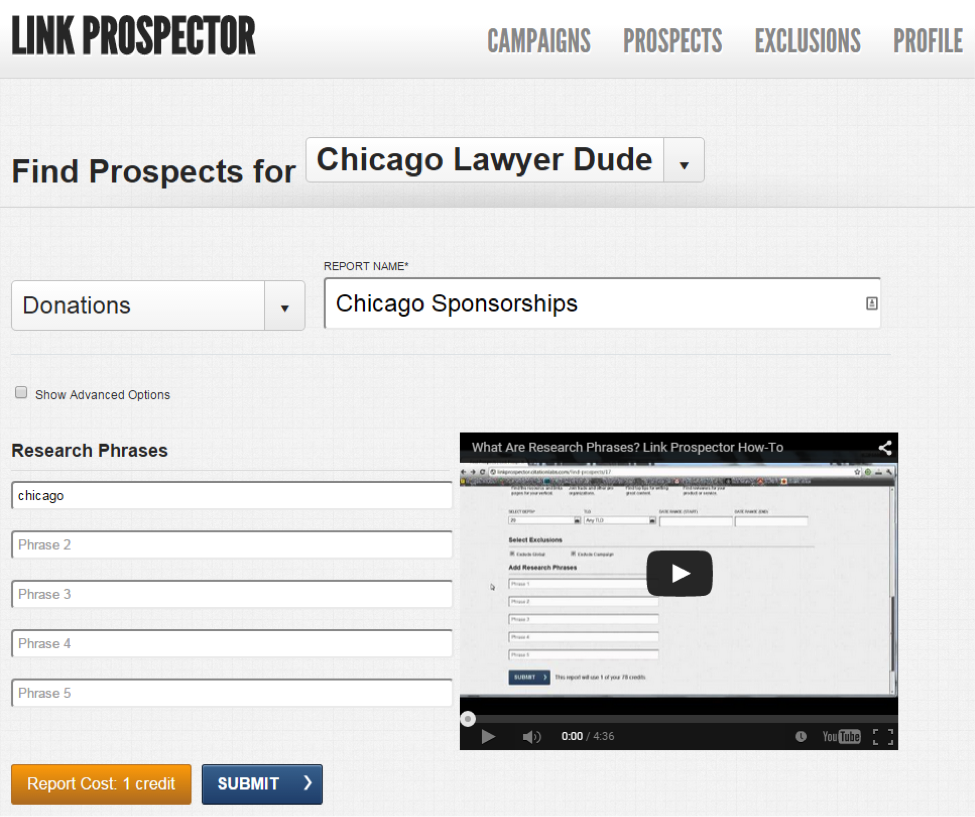 For only 1 credit (free trial includes a credit), you can save yourself a ton of time by running a Link Prospector query to find sponsorship opportunities in your city. Simply choose the sponsorship/donation type and enter your city as the keyword.