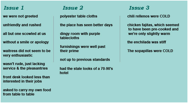 | 3) Discard any that appeared less than 3 times, unless the review in question makes an accusation of a hazardous or illegal situation. You might want to keep your discard list on file for your client, in case a less-cited issue is an emerging one instead of an isolated one. |