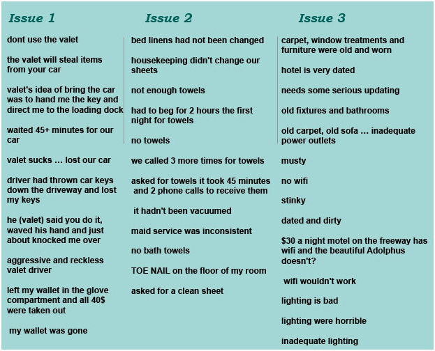 Let’s take a quick look at how this same process can work in another industry. For this, I’ve chosen a legendary hotel, founded in 1912 – the Adolphus. Guests are deeply impressed by the architecture and history of this landmark, but here are some problems being cited in both the Yelp and Google Reviews. *I had planned to look at TripAdvisor as well, this being a hotel, but my list had already gotten too long for easy reading. For the sake of convenience, I’m keeping this short:
