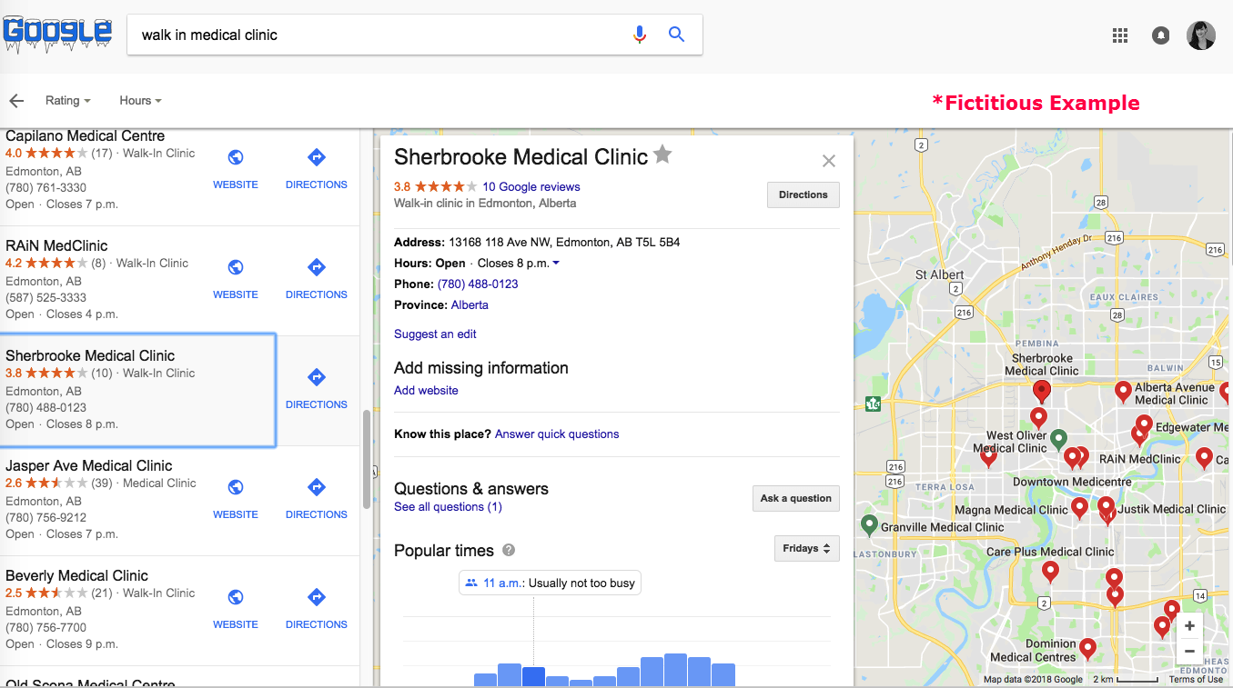 Randy could have two additional practitioner listings. He could have one at the address of the Edmonton Sports Institute where that practitioner was for orthopedic surgeon and he could have one at the walk-in medical clinic where his listing was for just doctor. That’s an opportunity for basically casting a wider net and the ability to rank for more terms.