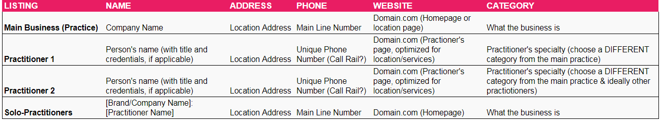 You’ve got your main business listing which is the practice, so that’s all pretty basic, company name, address, the main office line, linking to the homepage or location pages, if you have a bunch of locations, and the category is what the business is.