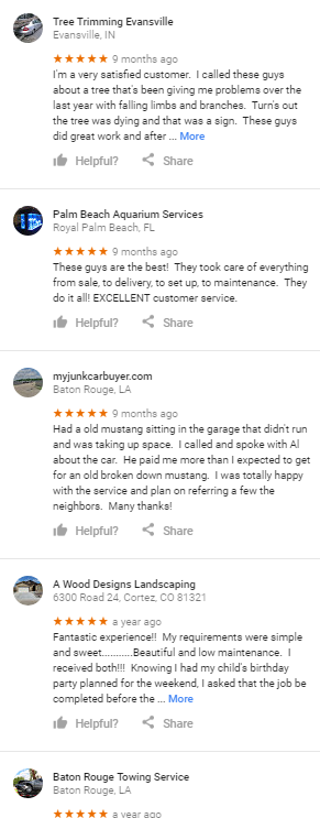 How likely is it that this “person” hired a tree service company in Indiana, an aquarium service in Florida, sold their car to a buyer in Louisiana and got some landscaping in Colorado? Also, Google must think that the fact that they just “happen” to be left on listings that are named as keywords is just a coincidence right? I come across cases like this every day and they are not hard to find.Turn your business into a review engine with the help of Reputation Builder; grow, manage, and market your reviews! Start your free trial today.