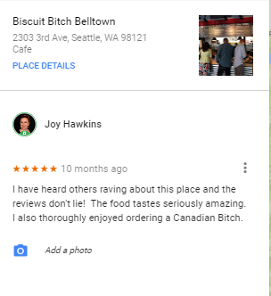 I wrote a review for a place in Seattle called “Biscuit Bitch” and using the word “bitch” in my review caused it to get filtered. As soon as I edited the review to remove the word, it became publicly visible.