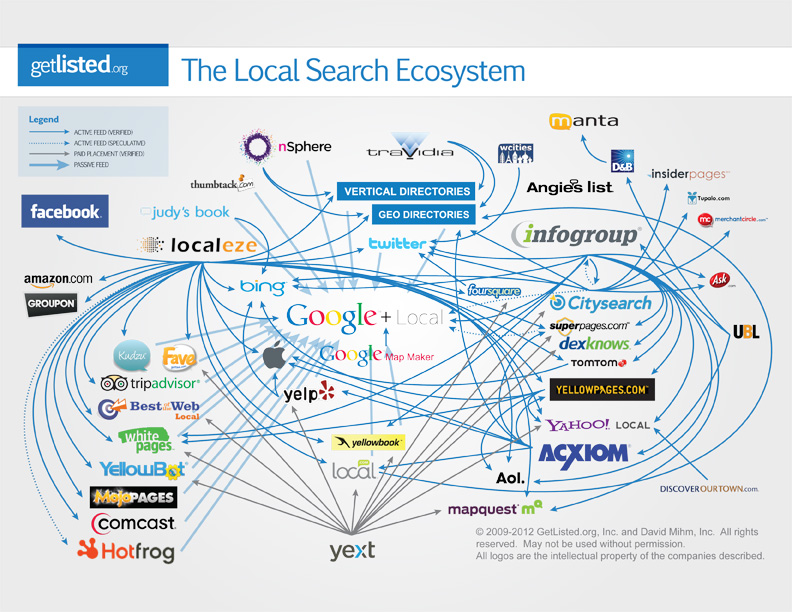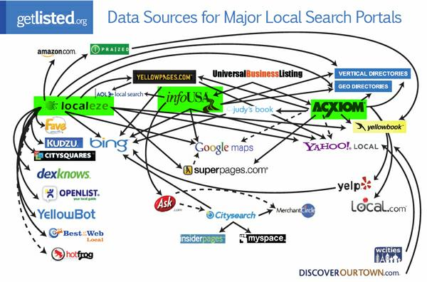 Primary Data Aggregators – these are the 4 data aggregators with most influence in the ecosystem (Infogroup, Acxiom, Localeze, Factual);