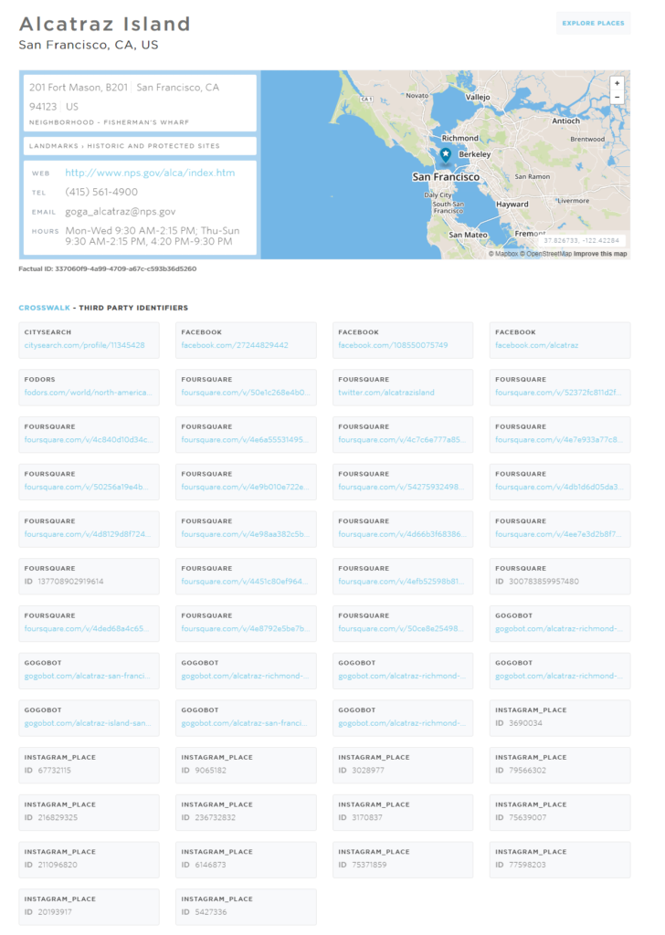 3) Less Significant Sources – there are literally hundreds of other data sources different sites use. I already linked a bunch of times to the Apple Maps attributions page, which is a very good example. Factual have a feature called Crosswalk, through which they collaborate with business directories (and other types of sites) and display links on their own listing pages to third-party pages for the same business. The full list of the sites Factual collaborate with is not publicly accessible, but their total number is more than 50.