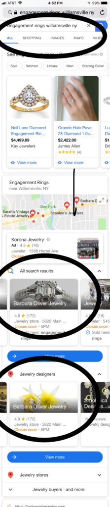 For example, in this search for “Engagement rings, Williamsville NY“, Google decided to show a picture of an engagement ring on the listing instead of their default photo. Google will match the photo shown to the query. That’s extremely valuable. You want to have photos of all your different products, and services, whatever it is, that can match the query.