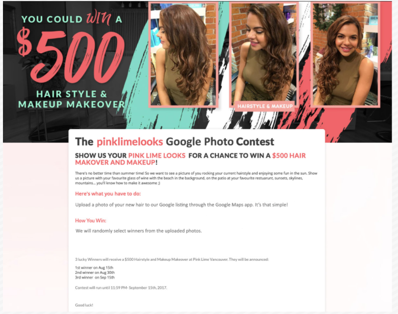 I took this concept and I rewrote it for Google as the Pink Lime Looks Google photo contest. Just upload a photo of your new hair cut to our Google listing through the Google Maps app. It’s that simple. And we’ll randomly select a winner from the uploaded photo. That’s a way of taking the Instagram photo contest idea and using it to encourage more photo uploads on Google.