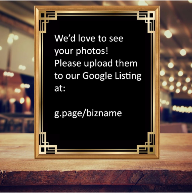 Something that says, “We’d love to see your photos! Upload them through Google Maps at g.page/business name.” (You can set up this short link in the Info tab of your GMB dashboard). You can set up a selfie wall. If you think of Instagram, people set up selfie walls, and say “Hey, take a picture at our selfie wall and then tag our business.” You could encourage photo uploads to Google in the same way.