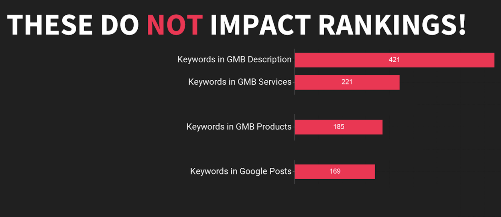 If you look at the Local Search Ranking Factors, one of the questions I asked was “What are some things that don’t impact rankings?” This includes stuff like keywords in the business description, keywords in services, keywords in products, keywords in Google Posts. You can put keywords in these areas but they actually don’t have any impact on ranking.