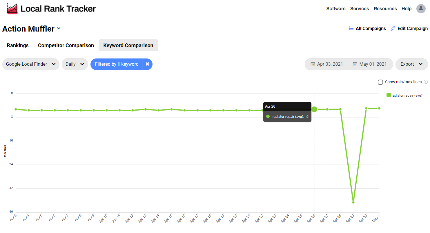 So knowing that this variation exists, and knowing that rankings fluctuate so much, it should give you some confidence that you don’t really need to panic when you see a big ranking drop. For example, if my business is âAction Mufflerâ, and I’m tracking the term âradiator repairâ, I might see that on the 28th of April, I was ranking in position 6 and then the next day, we totally plummeted. Now I rank in position 100. You know, sometimes if you’re an agency, you might get a phone call from a client saying – âHey, what happened to my rankings, we totally fell off for radiator repair. I care about that term. I want to rank for it. Something’s gone wrong with the SEO. You have to fix it.âÂ