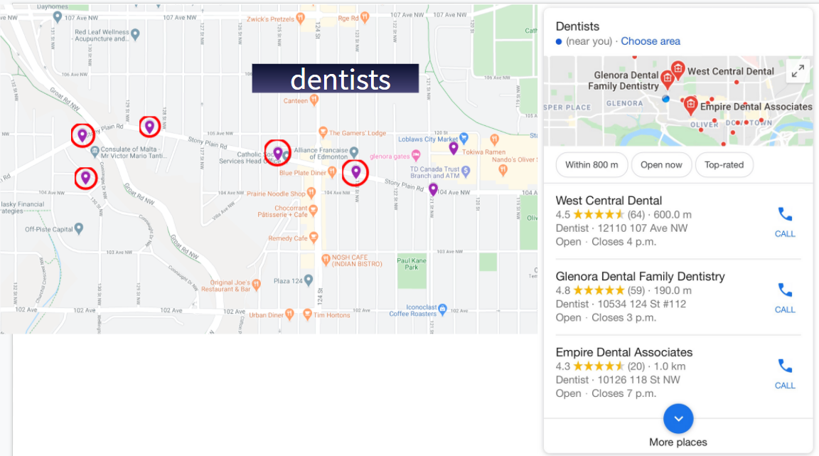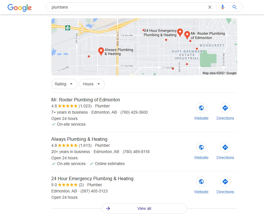 Let me show you how that works in action if I run a search for “plumbers.” Google knows I’m located in Edmonton and it’s going to give me a three pack. It’s definitely more precise than that. These businesses are actually all pretty close to my neighbourhood. You can see that this map is centered right around where I’m currently located.Â