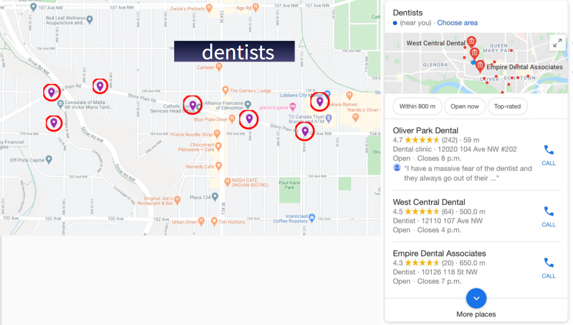I’ve recorded the results so you can see how this works. This is what the local pack looks like at my location. I’ve got these three businesses ranking, if I go one block up, it’s still the same results, I still see the same three businesses ranking. One block over I can see that âOliver Family Dentalâ has dropped out of the local pack. Now there’s a new business in there, âCindy Neufieldâ, then I go one block over and now two new businesses are in the local pack. This is just a two-block difference and my local pack has changed completely. I go another block and I get different businesses. You can actually see block by block, how the local results are changing. It’s pretty phenomenal what an impact proximity has on the local search results.Â