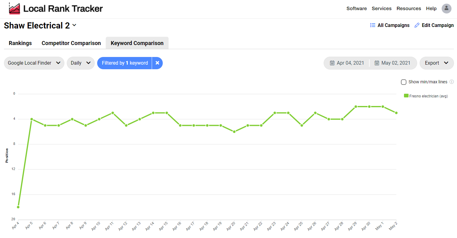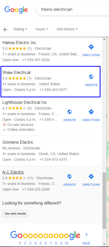 If I go to my search results, and I type in âFresno electricianâ…. Alright, well, Shaw Electrical is not in the top three. Where do I find my business? Here it is, what that’s like position 12. This rank tracker is not accurate.Â