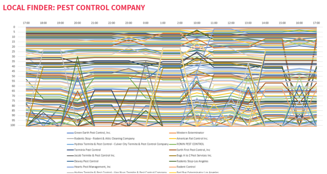 I wanted to see if we had the same kind of impact in local rankings. So we ran a similar study at Whitespark, where we checked local rankings for a number of terms, hour by hour. Here’s one of the example charts from âLos Angeles pest controlâ. You can see the same kind of thing, some businesses aren’t ranking at all. Then they have this big spike, they start ranking in position 30, and then they drop off the face of the map again. Other businesses, they’re ranking in like position 60, they’ll jump up to position 30Â and jump back down.Â