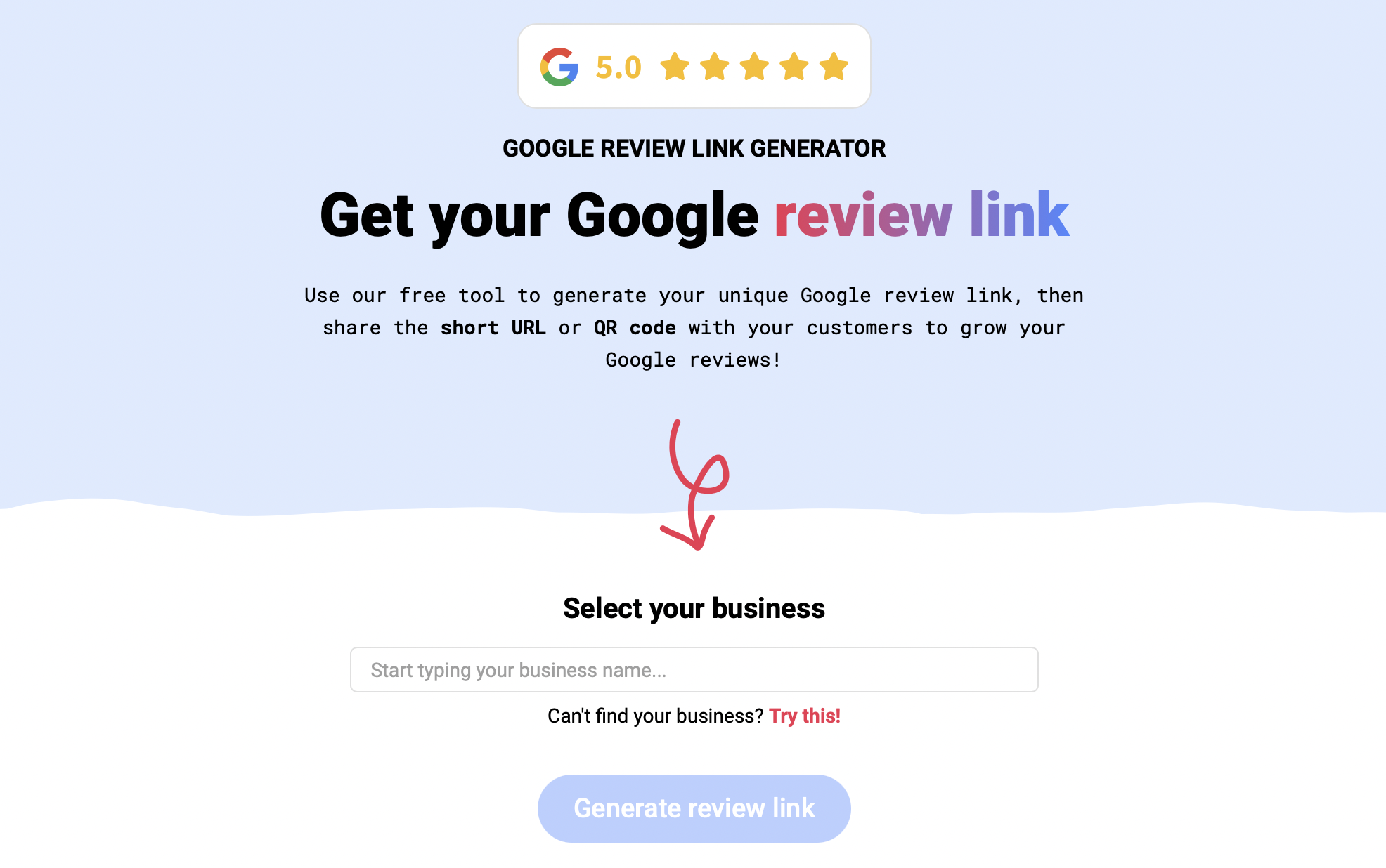 All you have to do is start typing your business name and the tool will generate a nice short reviewthisbiz short URL. Plus, it’ll create a QR code for you.