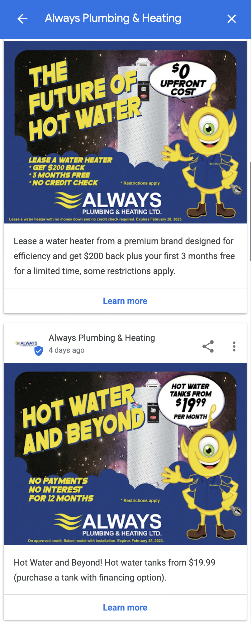 Always Plumbing and Heating have nailed their Google Posts. Every one of them is a special or an offer. They’re talking about what they do. They’ve got the pricing right in the graphic. Great stuff.
