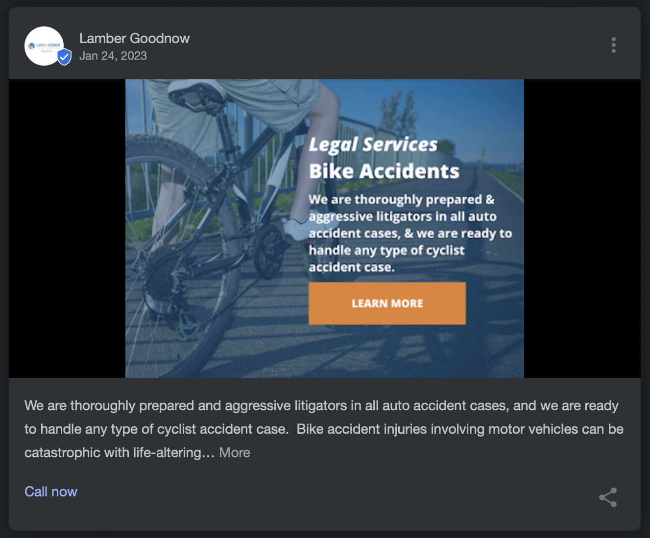 I love posts that specifically highlight your services, because when people see that you do that thing, it can help them convert: Oh yes they do auto accidents, ohh, look, free case review, ohh, bike accidents, Uber accidents.