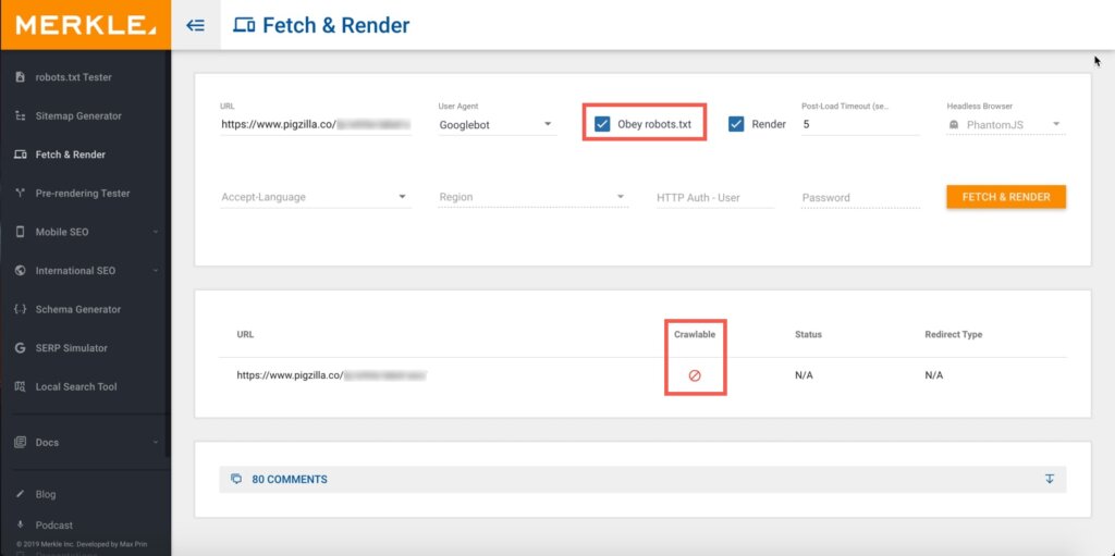 Make sure to check the “Obey robots.txt” box and click the “Fetch & Render” button. If the results show a “no symbol” like in the screenshot below, then Google is not able to crawl that page.