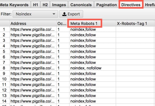 Another way you can see if pages are telling Google not to index them is by using a crawling software like ScreamingFrog as I mentioned before. You can crawl your site as Googlebot and check the “Directives” tab and look under the “Meta Robots” column. If any pages show the word “noindex” in the “Meta Robots” column then Google is being told not to index those pages.