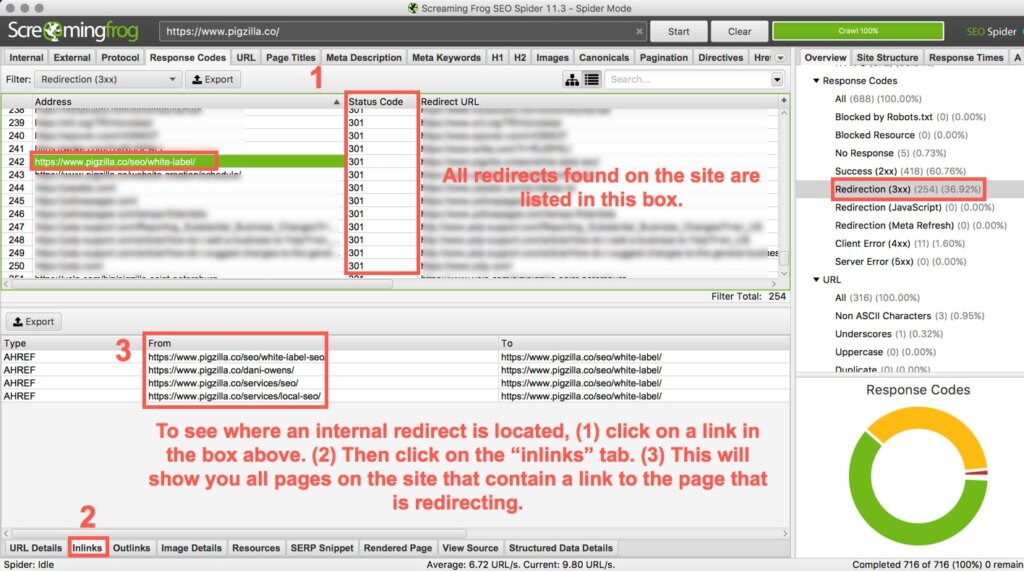 In Screaming Frog, click on the “Response Codes” tab. In the “Overview” tab on the right, click on “Redirection (3XX)”. This will pull up a list of all pages that have 3XX redirects. You can see the “Status Code” column to see which ones are 301s and 302s (redirects).