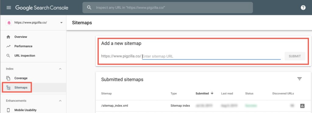 In Google Search Console, click on the “Sitemaps” tab. In the “Add a new sitemap” area, add the XML Sitemap path. Most likely this will be sitemap_index.xml or sitemap.xml.