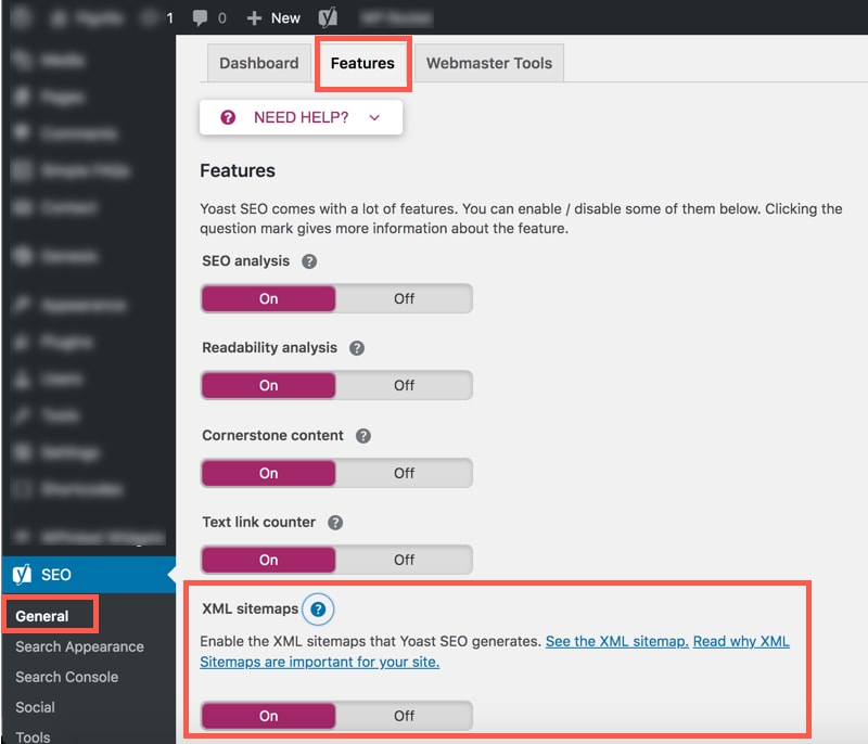 Once you have installed the plugin and configured it, you can confirm the XML sitemap feature is on by going to the “General” tab and then the “Features” tab. You can also view the XML sitemap here.