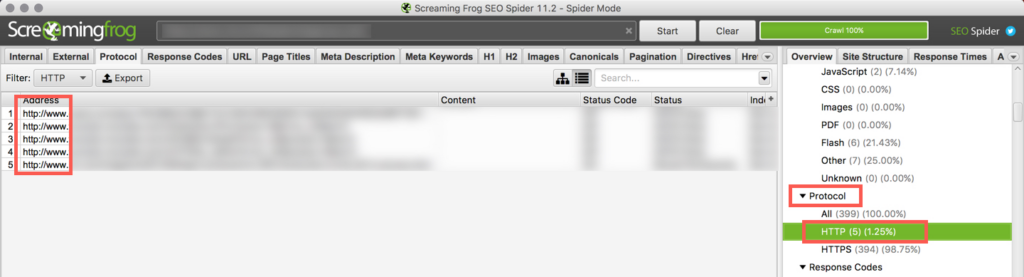 In Screaming Frog, under the “Protocol” section, click on the “HTTP” tab to see any internal links on the site that are still HTTP.