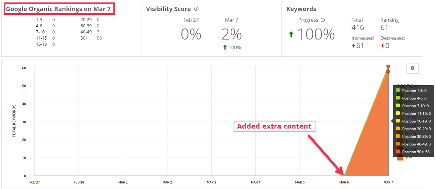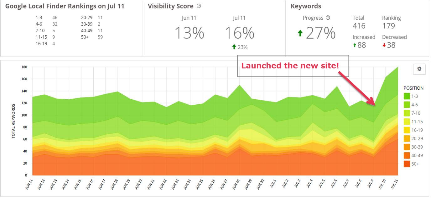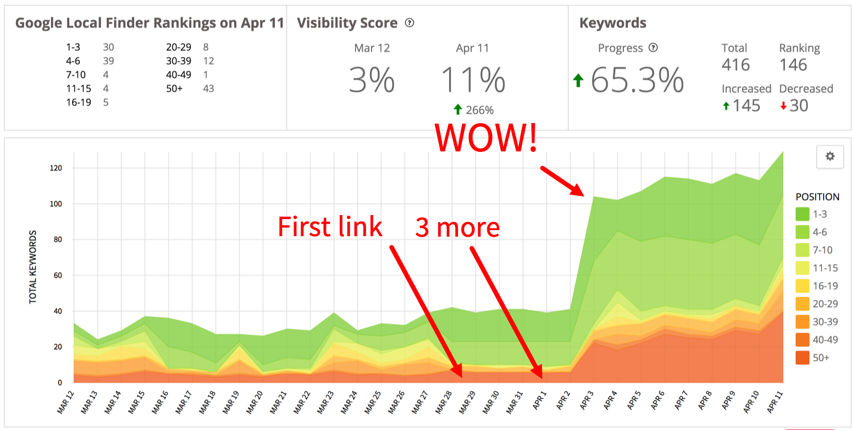 Wowee! These links had a huge impact and we saw a massive spike in the ranking proximity and rankings for many different keyphrases.