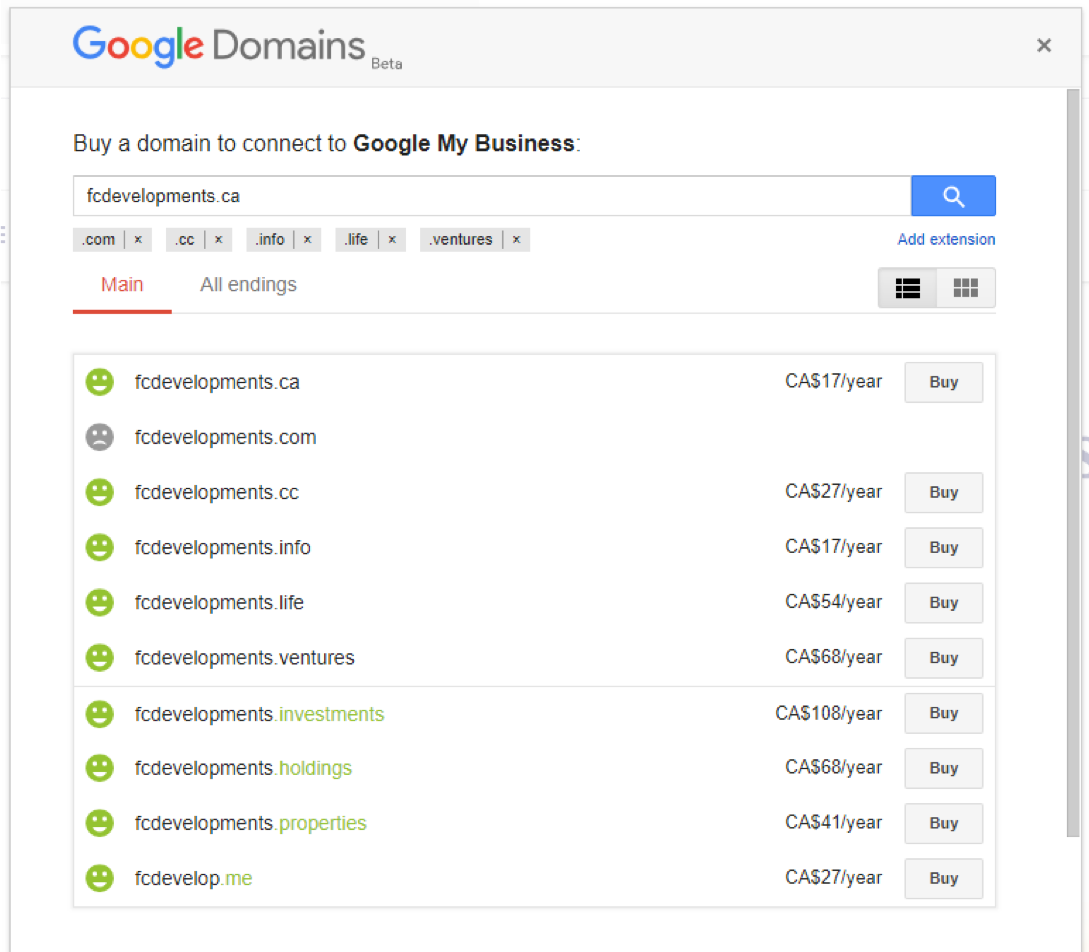 I didn’t want to spread this URL all over the web in their citations and then have to go back to update them later, so I purchased a domain name from Google. They have a domain buying feature right inside GMB!
