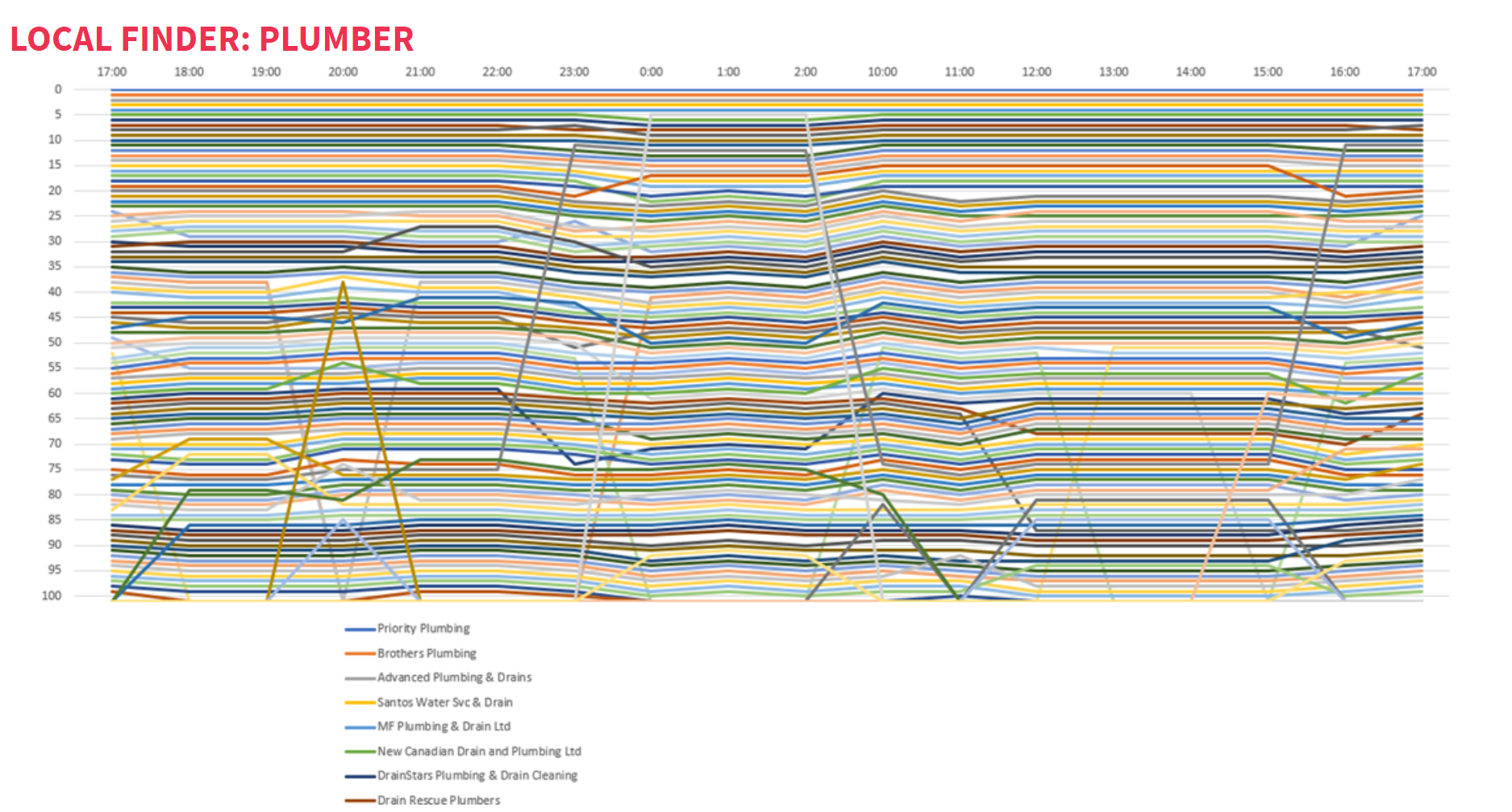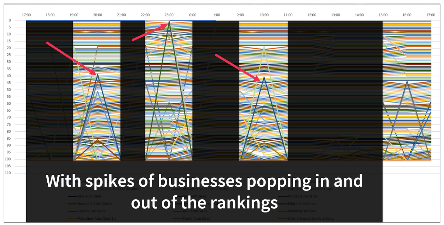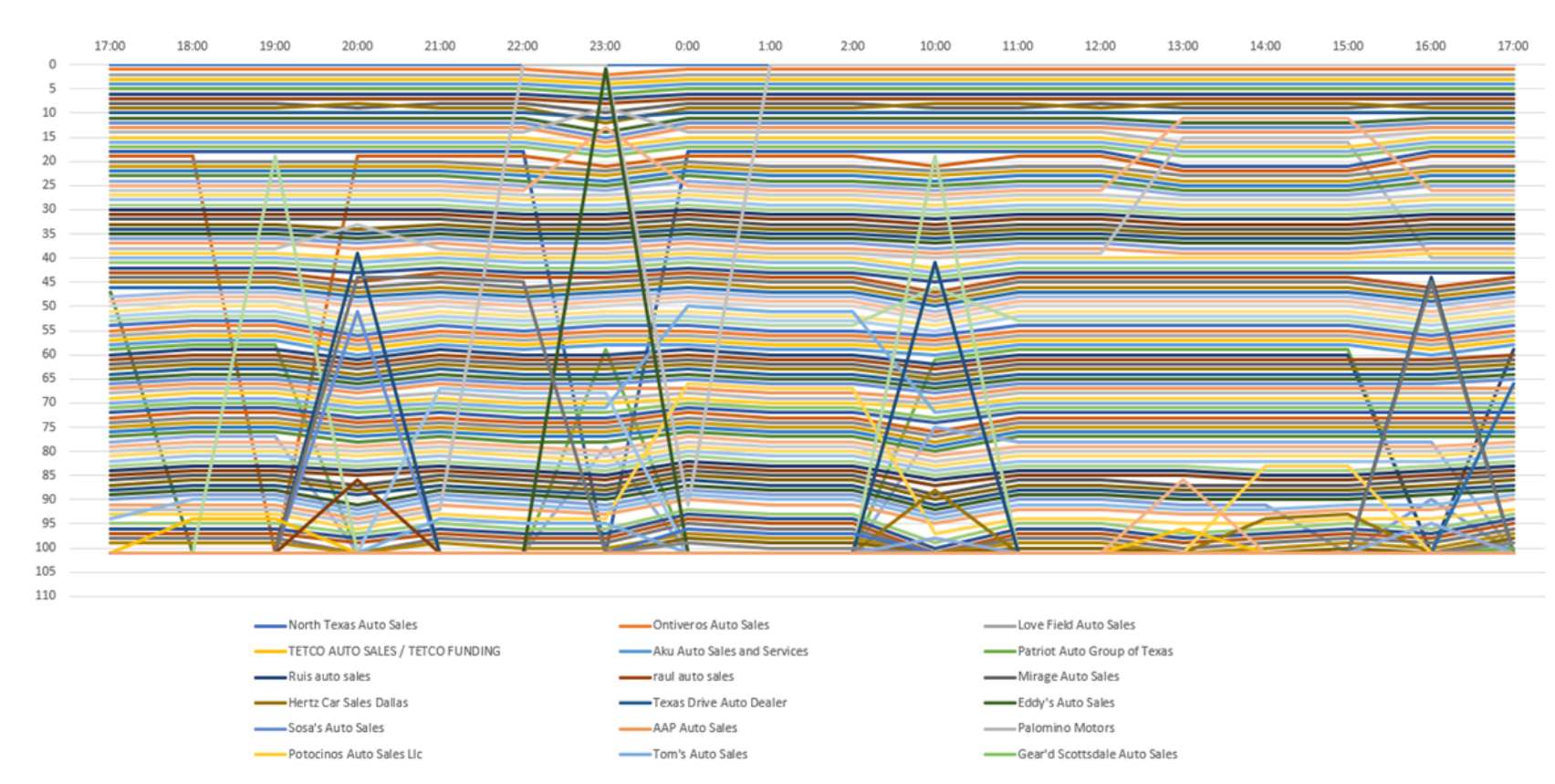You can see that in the image above, basically every one of these rows represents a business, listed in the legend below. You can see that the business which is represented by the orange line, AAP Auto Sales, is ranking in position 25 for a long time and then jumps to position 15 and then back down. The rankings are moving by the hour.