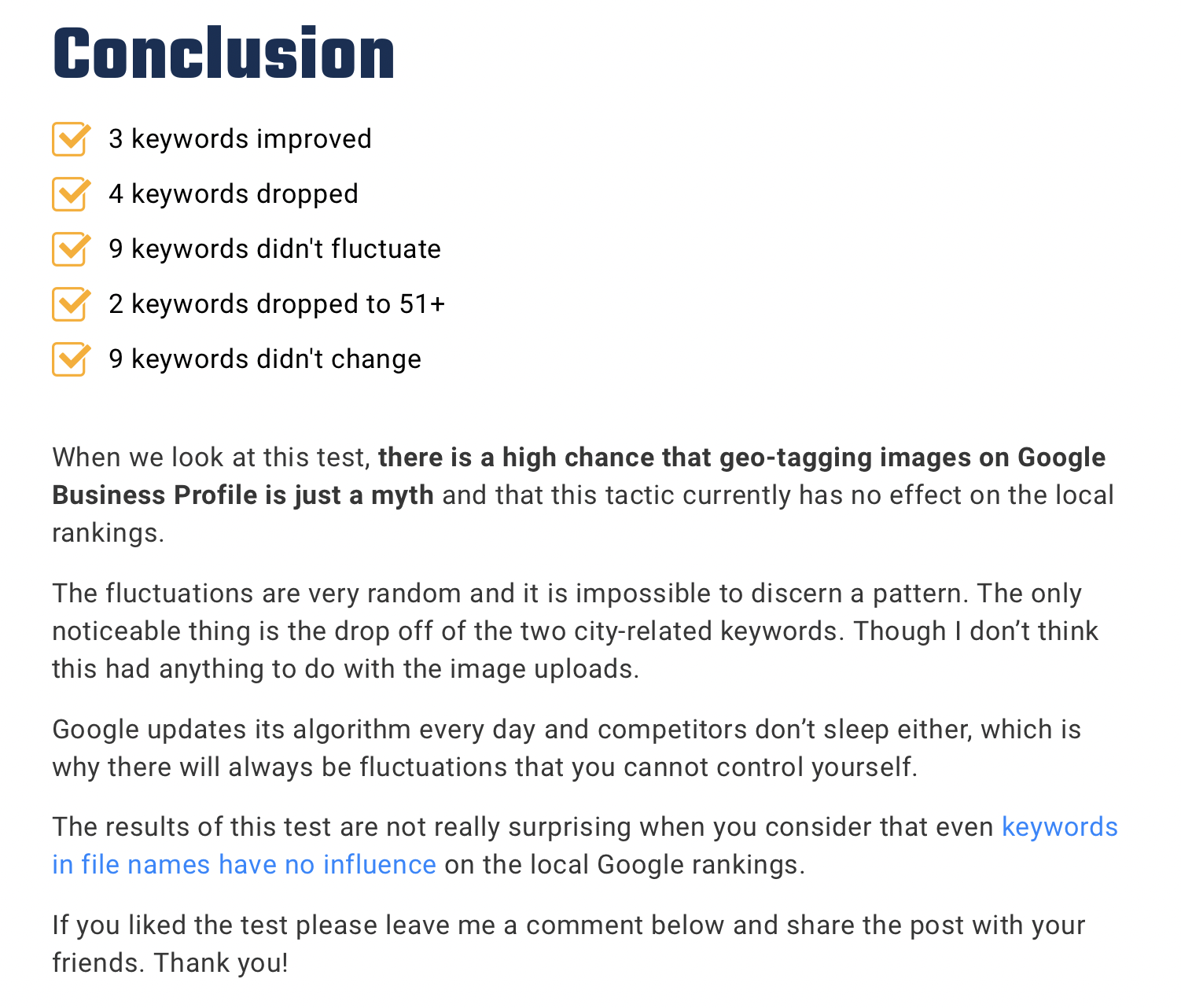 And to this I say, you should check out these two studies. One is from Joy Hawkins, who did this case study where they tested the influence of geotagged images on rankings.