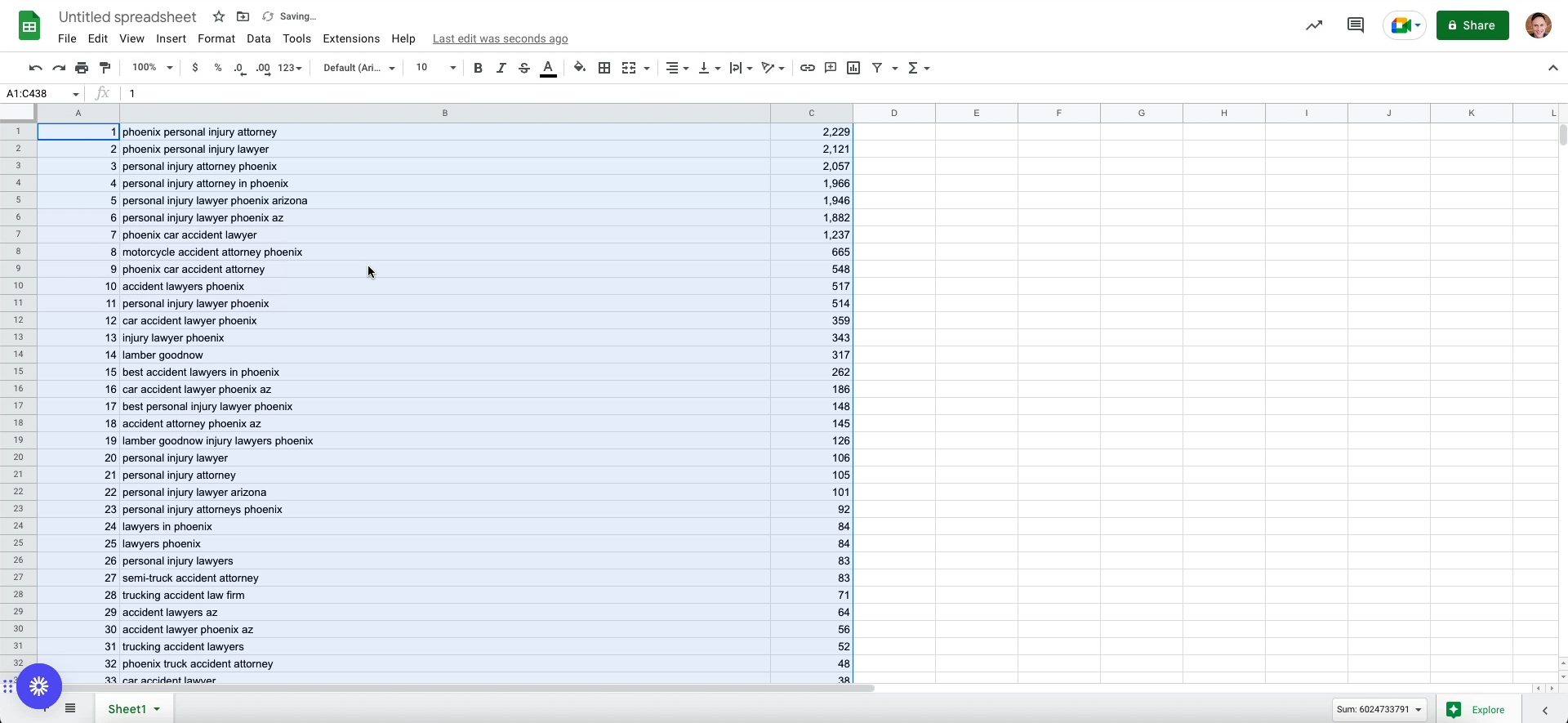 And then you go Command+V, and boom, look at that. You have all of your keywords in one spreadsheet.