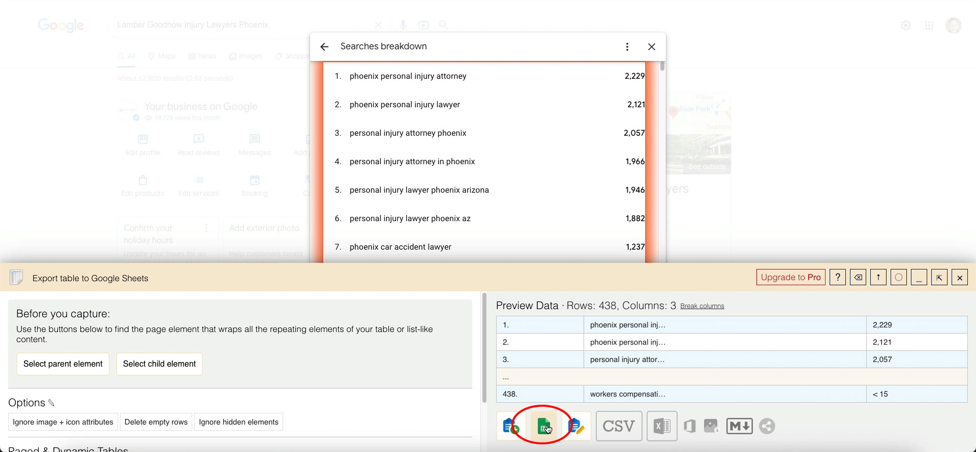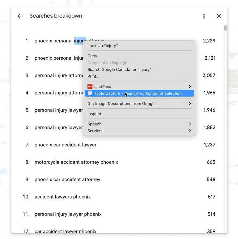Second, if you take a keyword list like this, you can right-click on one of the terms, go to “table capture”, and you’ll see that it pulls it in.