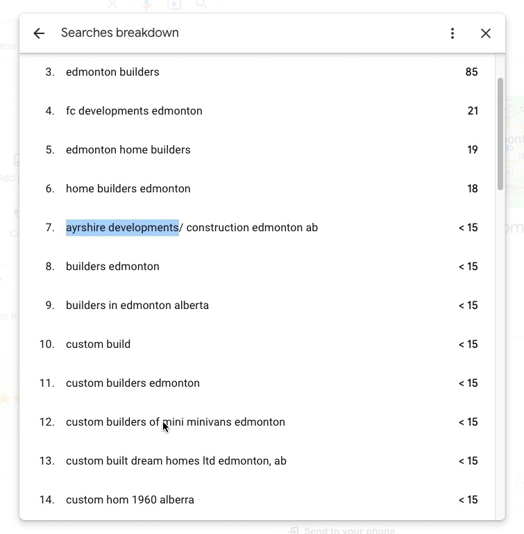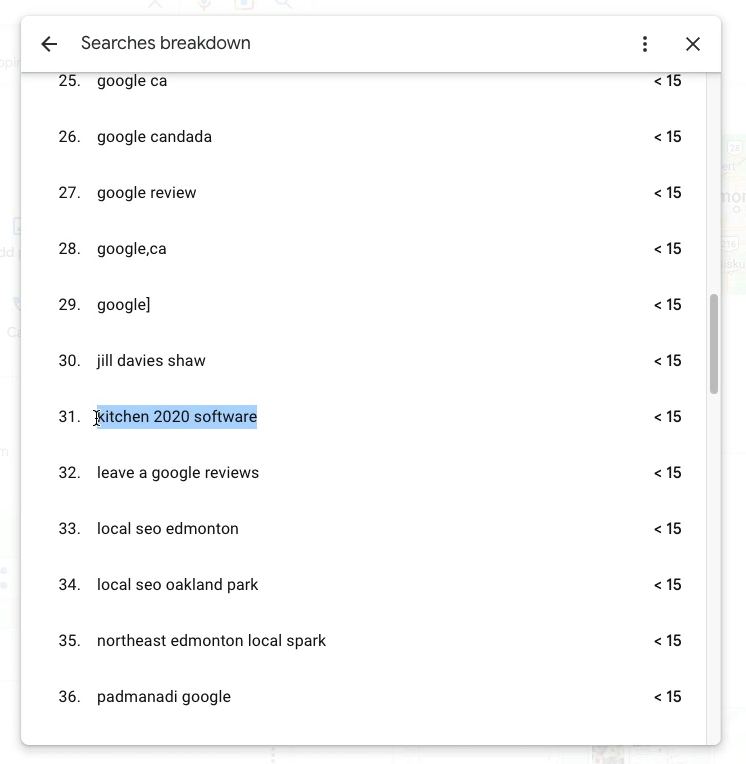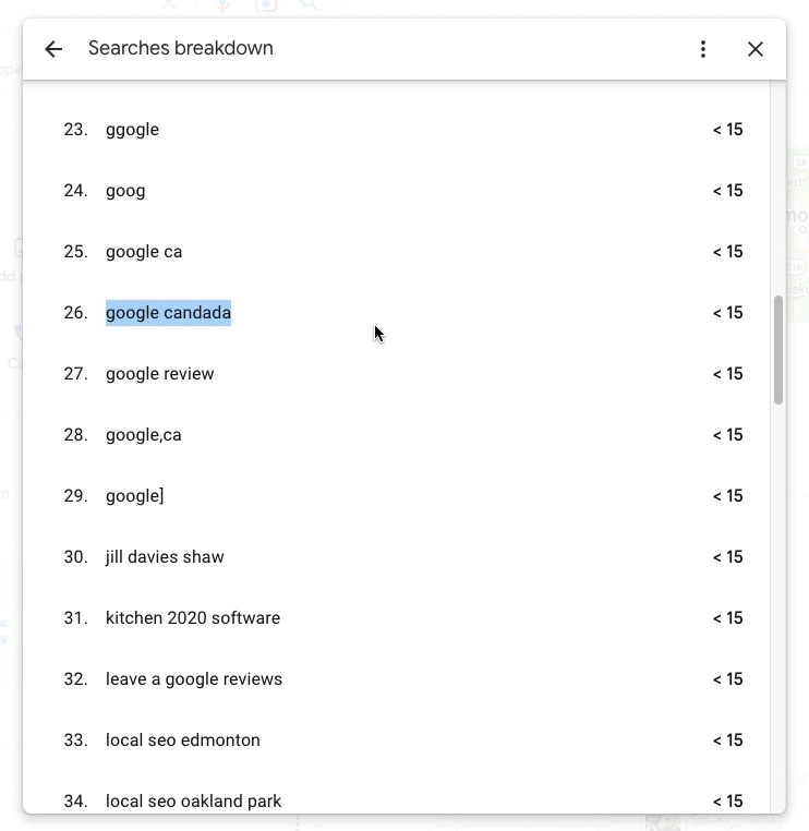 And every time I look at this data, I’m always surprised to see really fun keywords in here. Like, who knew that the Whitespark listing ranked for “google candada” or that we rank for “kitchen 2020 software”.