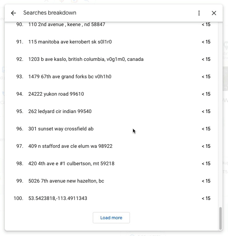 So, if you click on the Performance section of your GBP and scroll down, you can see all of these keywords that your Google Business Profile is ranking for. If I click “See more” I get a whole list of them.