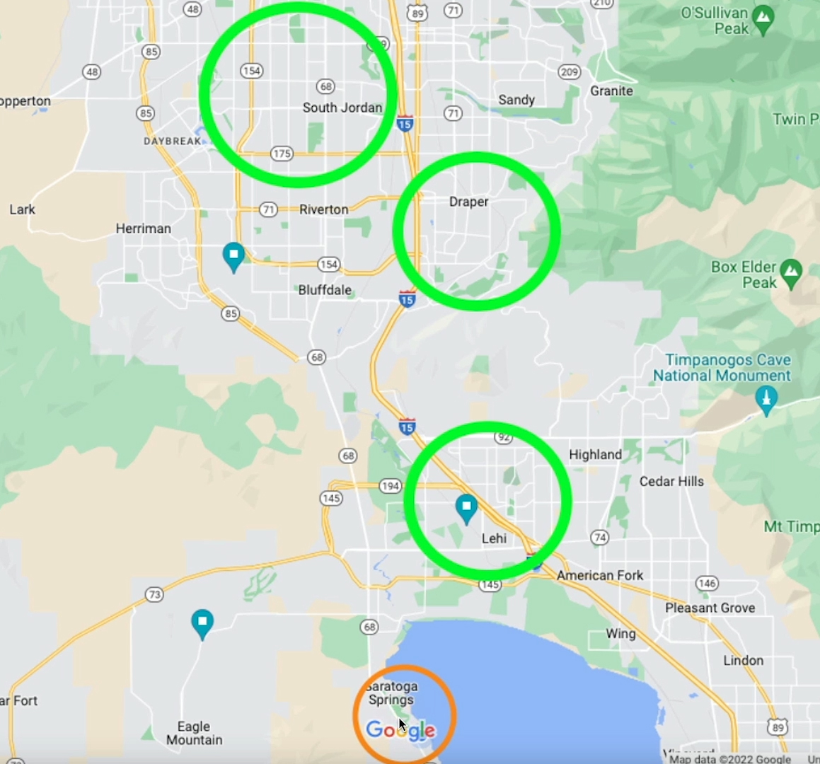 His actual business is registered down in Saratoga Springs, which is not overly populated. As a business that installs Christmas lights, he actually cares to drive more traffic in the larger areas to the north: South Jordan, Draper, Lehi.